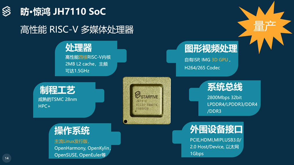 周杰表示:JH7110作為一款高性能、低功耗和高安全性特點的SoC芯片,里面集成了賽昉科技自研的低功耗ISP,提供強大的H.264/H.265編解碼能力,支持雙路1080P@30fps編碼,顯示輸出可支持2路4K雙屏顯,6種圖層疊加顯示,可以為客戶提供強大的多媒體支持能力。該芯片已在開源硬件、PC/平板、工業(yè)控制、網(wǎng)關(guān)/路由等應(yīng)用場景小批量量產(chǎn)或完成導(dǎo)入。今年會在更多領(lǐng)域推廣該產(chǎn)品,出貨量會有比較大的飛躍。