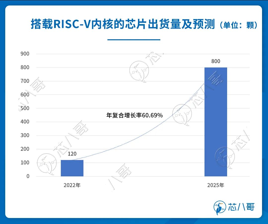 從出貨量來看,根據(jù)RISC-V International的數(shù)據(jù),2021年基于RISC-V架構(gòu)內(nèi)核的芯片出貨數(shù)量已達到120億顆,預(yù)計未來4年將維持60.69%的年復(fù)合增長率,到2025年出貨量將達到800億顆。值得一提是,目前100億顆出貨量當中有接近50%來源于中國廠商,并且據(jù)其預(yù)測到2025年中國廠商的占比有望達到75%,成為RISC-V芯片的絕對領(lǐng)跑者。